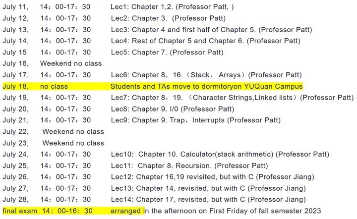 除第一天(7 月 11 日)外,理论课当天上午 9:00 - 11:30 均有助教上实验课,内容包括但不限于复习上节课所学、作业讲解、实验讲解、实验验收。实验课不会点名,其中实验验收必须线下在自己班的助教处验收,其他时候可以去听其他助教讲课。因为大部分助教都是第一次讲课,不一定能讲得很好,也鼓励大家去听讲的好的助教授课。